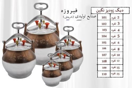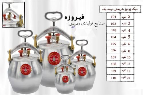 محصول دیگ زودپزاعلادرجه یک که ازضخامت بالایی والومینیوم ساخته شده وضمانت یک ساله داردکه درصورتی که زودپز هرعیب وایرادی درپخت وپزداشته باشدتعویض میگردد.واین محصول درسایزهای دونفره سه نفره چهارنفره پنج نفره شش نفره هفت نفره ده نفره پانزده نفره وبیست وپنج نفره ساخته میشودوبامارک فیروزه شریعتی دربازارتوضیع میشود