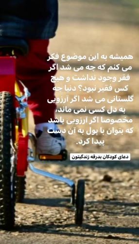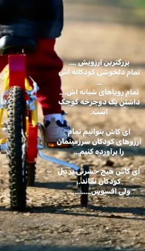 ❤️بهترینها نصیب قلب مهربونتون❤️ **آرزوی یک کودک** 🚲🚲🚲#آرزوهای_کوچک_من 🚲🚲🚲 بزرگترین آرزویش …. تمام دلخوشی کودکانه اش … تمام رویاهای شبانه اش…. داشتن یک دوچرخه کوچک است. ای کاش بتوانیم تمام ارزوهای کودکان سرزمینمان را برآورده کنیم… ای کاش هیچ حسرتی بر دل کودکان نماند.. ولی افسوس…………. 👈🏻همه ما در کودکی آرزوهایی را در سر می پروراندیم که هرگز نتوانستیم به آن ها برسیم. امروز خیلی از ما قدرت آن را داریم که آن آرزو ها را بار ها برآورده کنیم. کودکان بی سرپرست نیز آرزوهای زیادی در سر دارند که ما می توانیم پلی برای رسیدن آن ها به آرزوهایشان باشیم. در خیریه مردمی قزوین ،تعداد زیادی از این کودکان بی سرپرست و یتیم هستند که آرزوهای کوچکشان برای آن ها دست نیافتنی ترین آرزوهاست. آرزوهای قشنگ کودکی تان را برای ما بنویسید و آرزوهای کودکان بی سرپرست را ببینید. اگر دوست داشته باشید میتوانید آرزوی هر کدام از این کودکان را به دلخواه خودتان برآورده کنید. 🙂 برآورده كردن آرزوى چقدر دوستداشتنيه..كاش هر يك از ما بتونيم؛فرشته آشناى فقيرى باشيم. شك ندارم كه اين براورده كردن آرزو، خدا خيلى بيشتر دوست داره. دستاتون بخشنده؛ دلتون شاد❤️🥰
