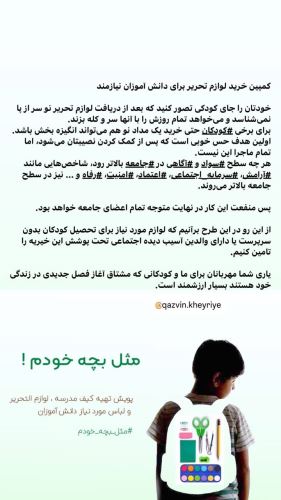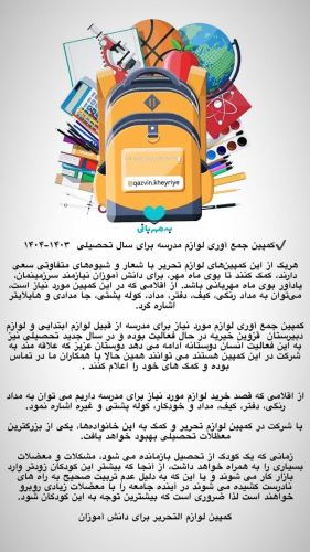 خیریه مردمی قزوین امسال نیز مثل سالهای گذشته قصد دارد در کمپین اول مهرماه امسال کودکان کم برخوردار را با کیف و لوازم التحریر نو راهی مدرسه هایشان کند.