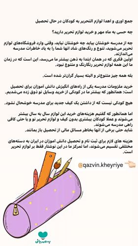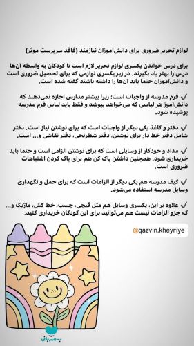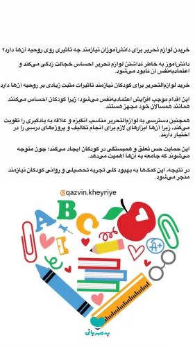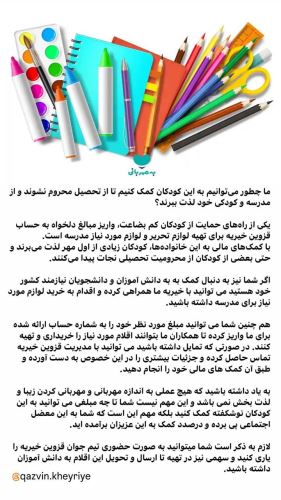 یک طرح انسانی: هدیه لوازم التحریر به دانش آموزان مستحق همه ما لذت خرید مداد و پاک کن و دفتر و جلد کردن کتابهامونو قبل از باز شدن مدارس چشیده ایم. حالا می توانیم این لذت را به کودکان نیازمند هدیه کنیم. با توجه به نزدیک شدن فصل مدارس، خیریه مردمى قزوين قصد دارد به کمک شما خيرين عزيز، بسته های ویژه شامل مایحتاج تحصیلی فرشته های کوچک نیازمند را تهیه و به آنها اهدا کند. مهلت شرکت در این طرح تا پایان وقت روز ۲۸شهریور می باشد.
