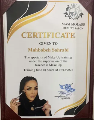 در تمامی لاینها هم مدرک بین المللی دارم از جمله لاینهای اصلاح ابرو، اصلاح صورت، اپلاسیون کل بدن پاکسازی، رنگ ، لایت ، شینیون مو
