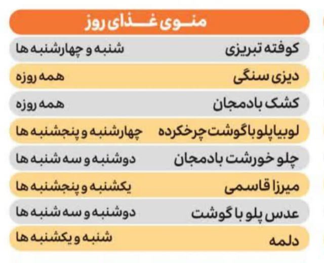 منوی غذای بیرون بر (کترینگ) باارسال رایگان