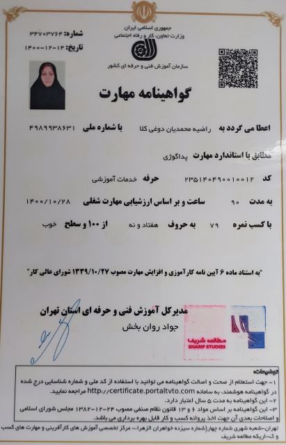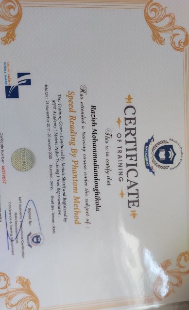 1400/02/20 تا --مدرس تندخوانی و تقویت حافظه دارای تجربه تدریس تکنیکهای تندخوانی, افزایش تمرکز, درک مطلب و تقویت حافظه در سطوح مختلف آموزشی. توانمند در طراحی دورههای آموزشی مبتنی بر روشهای علمی و عملی برای ارتقاء مهارتهای مطالعه و یادگیری سریع. آموزش بیش از 300نفر در قالب کارگاهها و دورههای حضوری و آنلاین با نتایج قابلتوجه در افزایش سرعت مطالعه و بهبود عملکرد