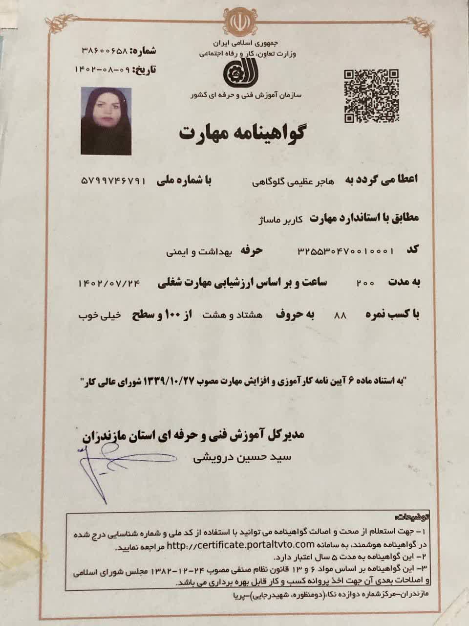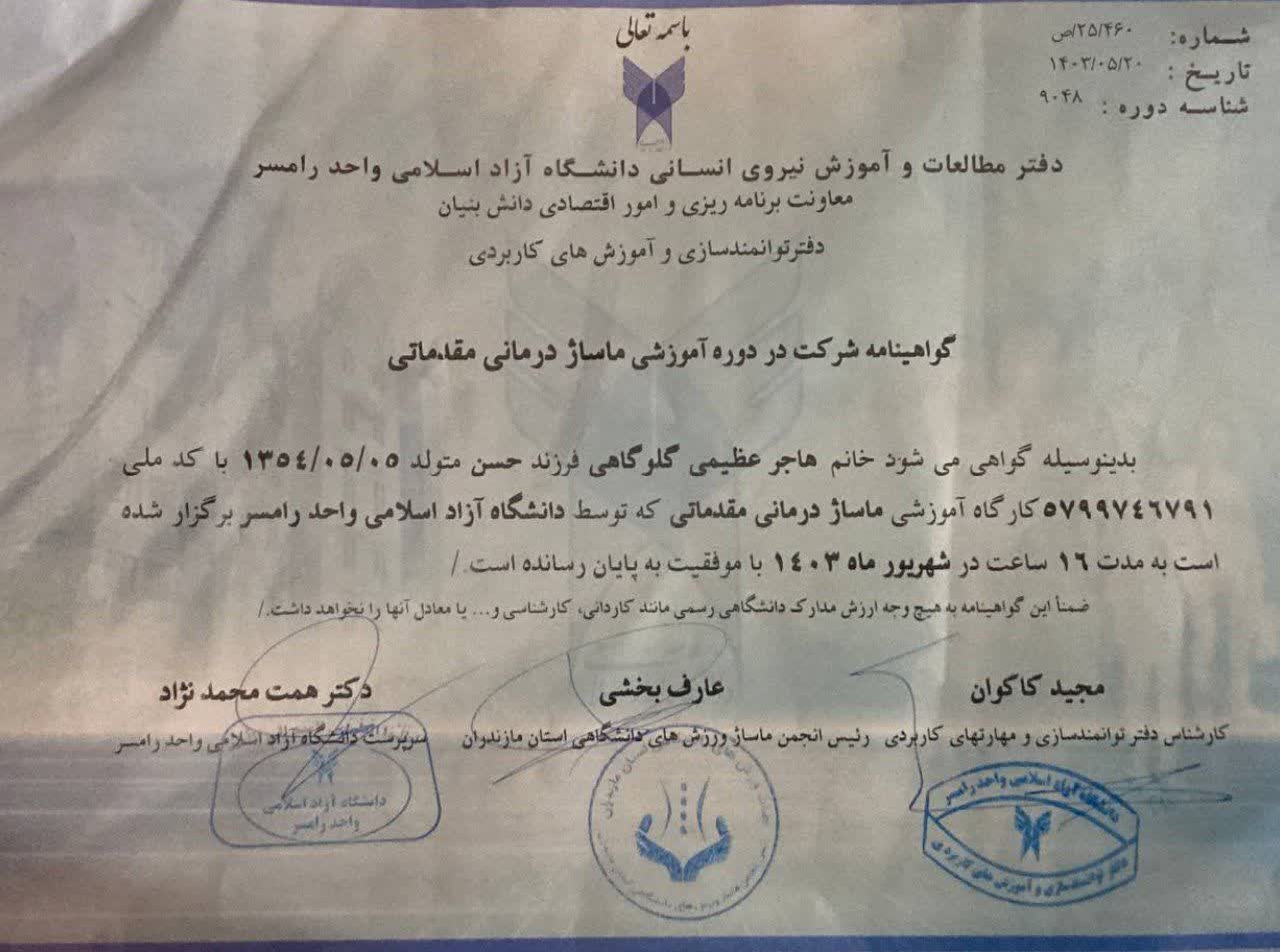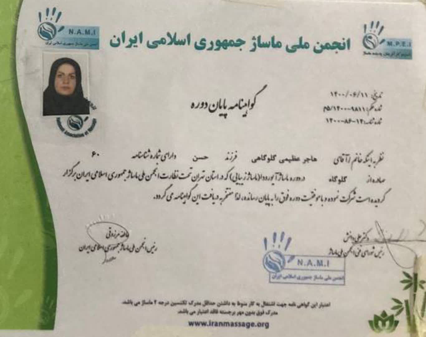 من هاجر عظیمی هستم ماساژور حرفه ای با بیش از 10 سال تجربه در زمینه ماساژ درمانی و آرامبخش با تخصص در تمامی انواع ماساژ , آز جمله ماساژ عضلانی , ماساژ فشار نقاط , ماساژ چهره و گردن شانه , ماساژ درمانی و..... همواره به دنبال ارایه خدمات با کیفیت بالا و رضایت مشتریانم هستم من طول دوران فعالیتم , توانسته ام به تمامی مهارتهای لازم دست یابم و گواهینامه های معتبری از دوره های آموزشی معتبر کسب کنم خدمات من به تمامی گروههای سنی قابل دسترسی هست و به دلیل تنوع و تخصص مورد پسند ورزشکاران و کارمندان و مردم عادی قرار می گیرد همه مشتریانم را با حساسیت و حرفه ای بودن و نیازهای فردی میپذیرم و همواره به این امید عمل می کنم که هر کس به من مراجعه کند احساس بهتری داشته باشد و آز فشار های روزمره خلاص شود