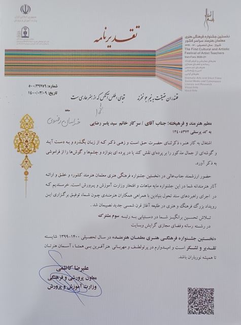 1400/02/26 رتبه سوم کشور در جشنواره معلمان هنرمند