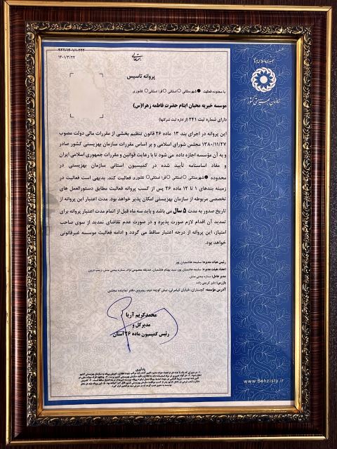 1402/03/23 پروانه تاسیس موسسه خیریه محبان ایتام حضرت فاطمه زهرا(س)