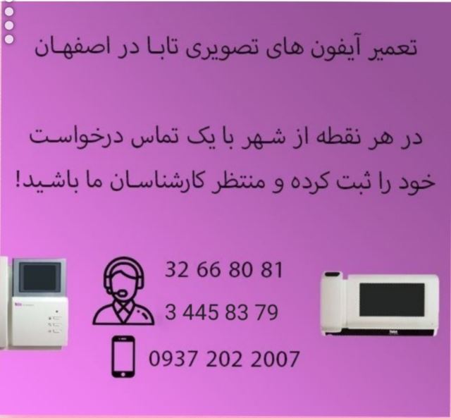 تعمیر و عیب یابی انواع آیفون های تصویری از جمله تابا الکترونیک , الکتروپیک , کوماکس , سیماران , زتا , آلدو , تابان ,کالیوز , ویدکس , کوکوم , کنوی , سامسونگ , سوزوکی , عرش , تکنوتل و ... در محل توسط کارشناسان , متخصصین و تکنسین های فنی و با سابقه در محل , درب منزل و یا محل کار شما در زمانی کوتاه توسط کارشناسان , متخصصین و تکنسین های فنی مجرب - ارائه کلیه خدمات مربوط به آیفون های تصویری در تمام نقاط شهر اصفهان رفع کلیه مشکلات و خرابی های مربوط به آیفون های تصویری از قبیل : خاموش شدن کامل گوشی یا صفحه نمایش ,نداشتن تصویر یا خط خطی بودن و برفکی بودن تصویر ,مشکلات مربوط به رفت و برگشت صدا, قطع شدن صدا و تصویر, مشکلات مربوط به قفل زنجیری درب بازکن, مشکلات و خرابی های مربوط به پنل ورودی آیفون تصویری, مشکلات و خرابی های مربوط به گوشی و درب باز کن - انجام تعمیرات تخصصی آیفون های تصویری در محل شما - نصب و راه اندازی انواع آیفون های تصویری در محل در صورت تمایل می توانید با شماره های شرکت تماس گرفته و درخواست خود را ثبت نمایید. شرکت ما دارای کارشناسان مجرب , متخصصین و تکنسین های ماهر و با تجربه دارای چندین سال سابقه در زمینه تعمیر , عیب یابی و نصب آیفون های تصویری در محل مشتری می باشد. در صورت مشاهده هرگونه خرابی یا نقص و عیب در آیفون تصویری خود می توانید تنها با یک تماس درخواست خود را ثبت نمایید. کارشناسان , متخصصین و تکنسین های فنی شرکت ما در کوتاه ترین زمان به محل شما فرستاده می شوند و آیفون تصویری شما را در محل عیب یابی , تعمیر و سپس دوباره نصب و راه اندازی می کنند. ||| برای ثبت درخواست خود می توانید با شماره های شرکت تماس گرفته و درخواست خود را ثبت نمائید